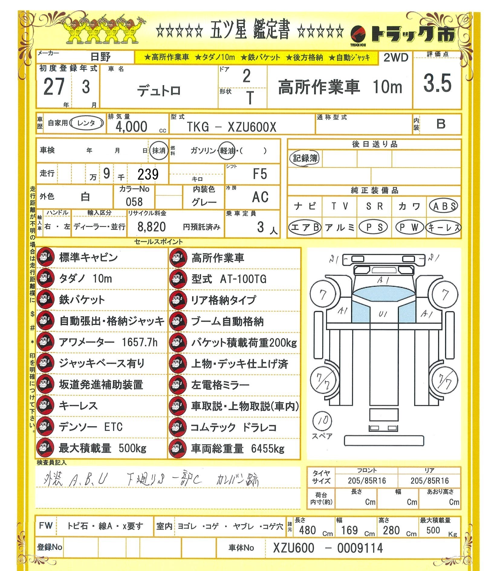 日野 デュトロ 高所作業車 10m 鉄バケット 後方格納 自動ジャッキ 500kg 5MT