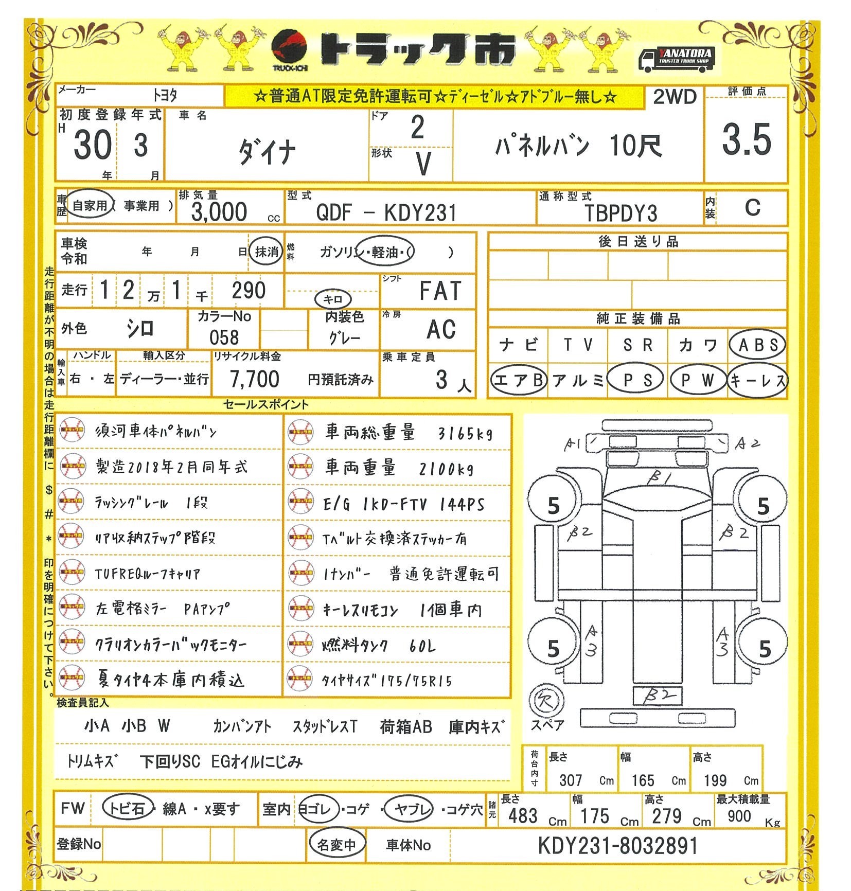【Y250D0069】トヨタ ダイナ トヨタ ダイナ パネルバン 標準 10尺 普通AT限定免許運転可 ディーゼル 0.9t AT