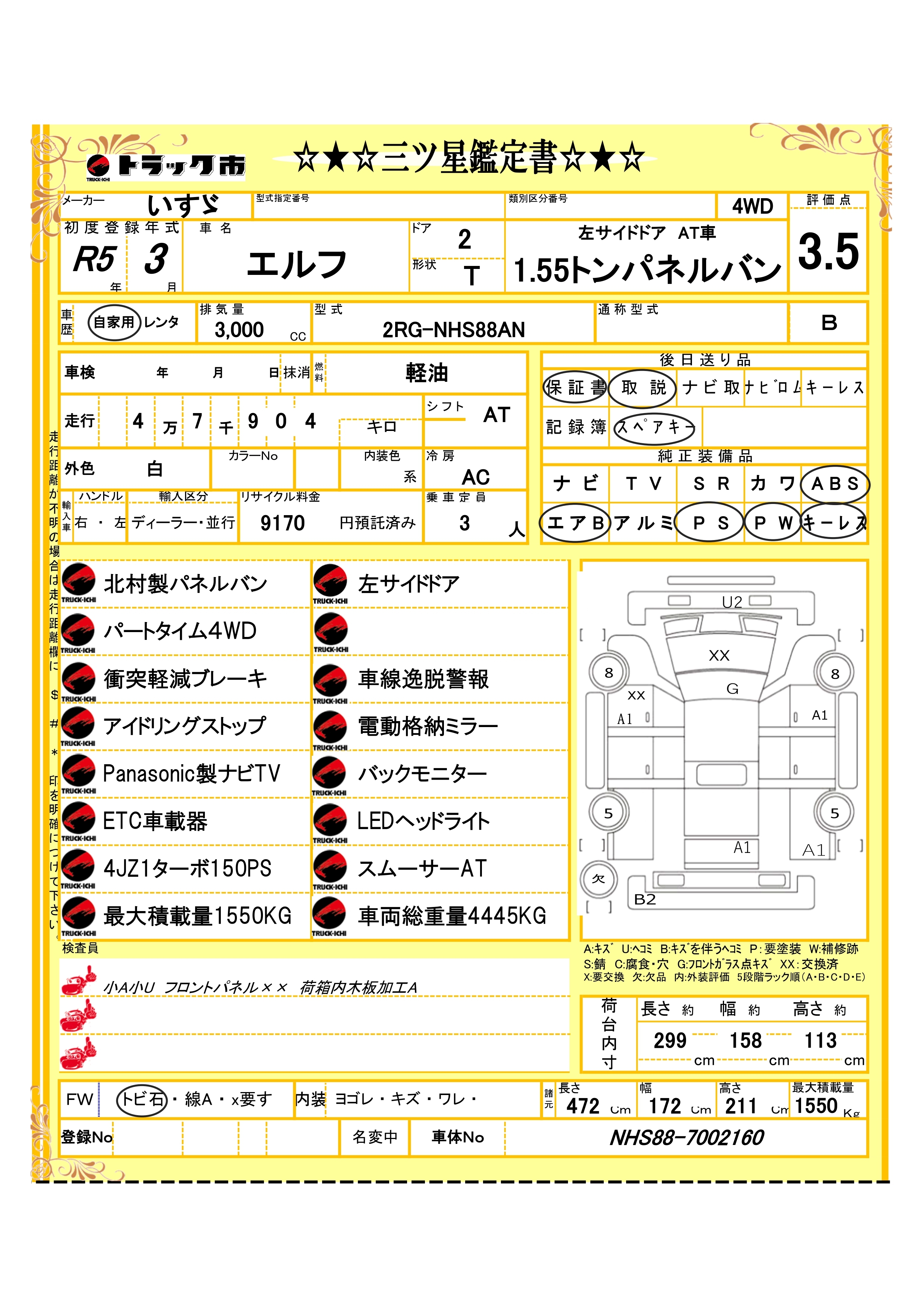 1.55トンパネルバン4WD 左サイドドア 衝突軽減ブレーキ ナビTV バックモニター AT車