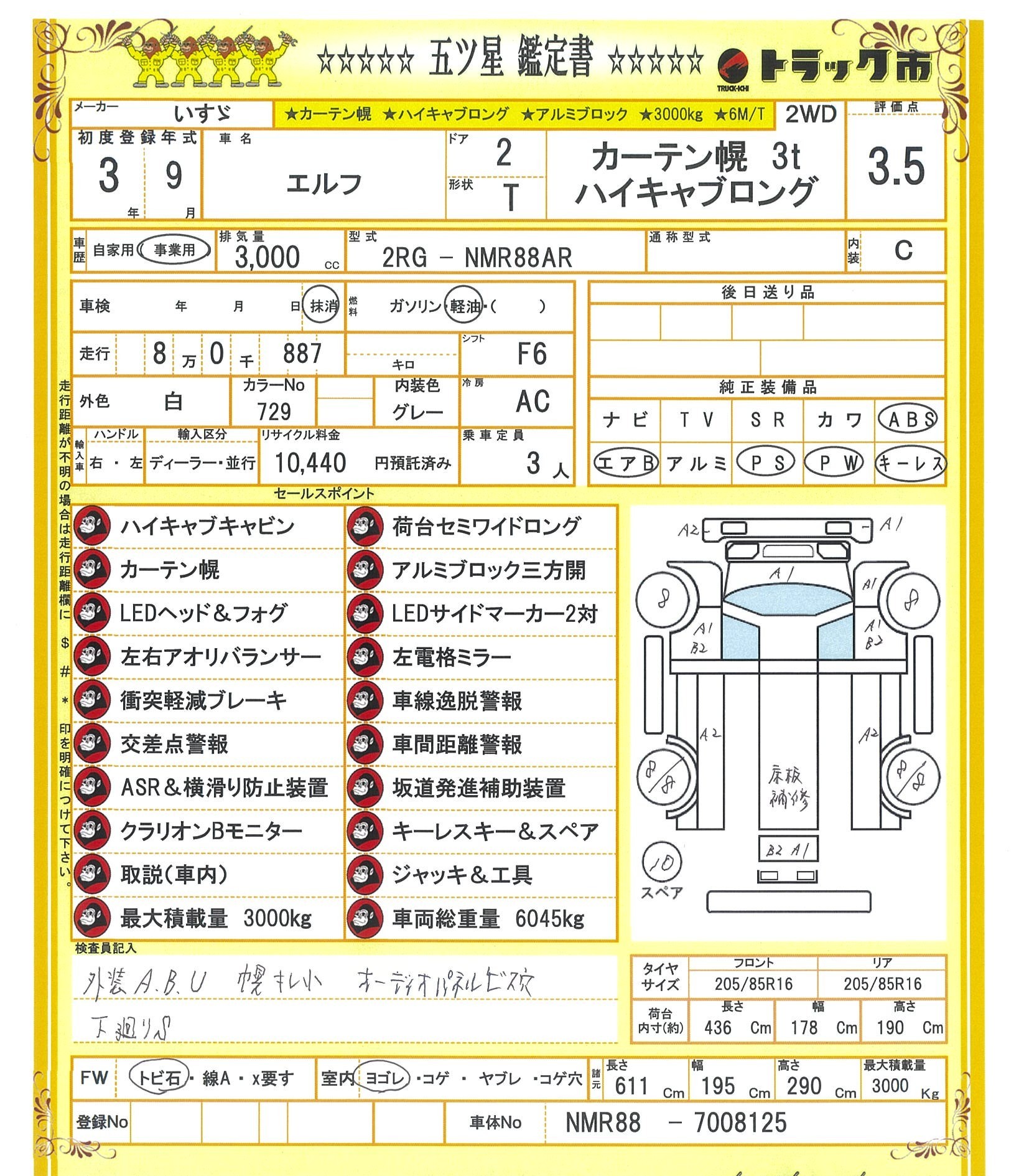 いすゞ エルフ カーテン幌 3t ハイキャブロング 平 アルミB 3方開 6MT