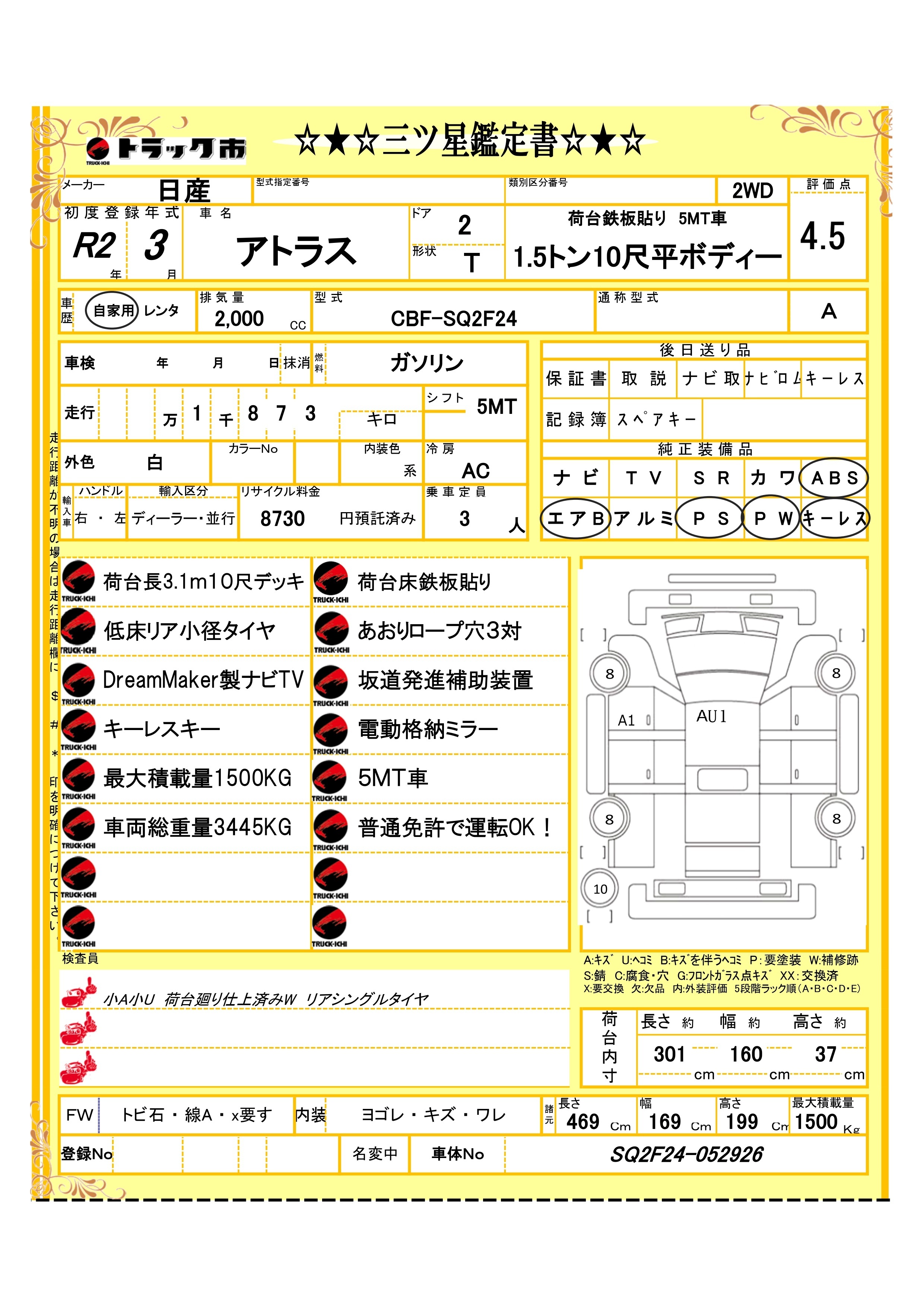 【Y250H0009】日産 アトラス 1.5トン低床10尺平ボディー 荷台鉄板貼り ナビTV 坂道発進補助 5MT 普通免許OK