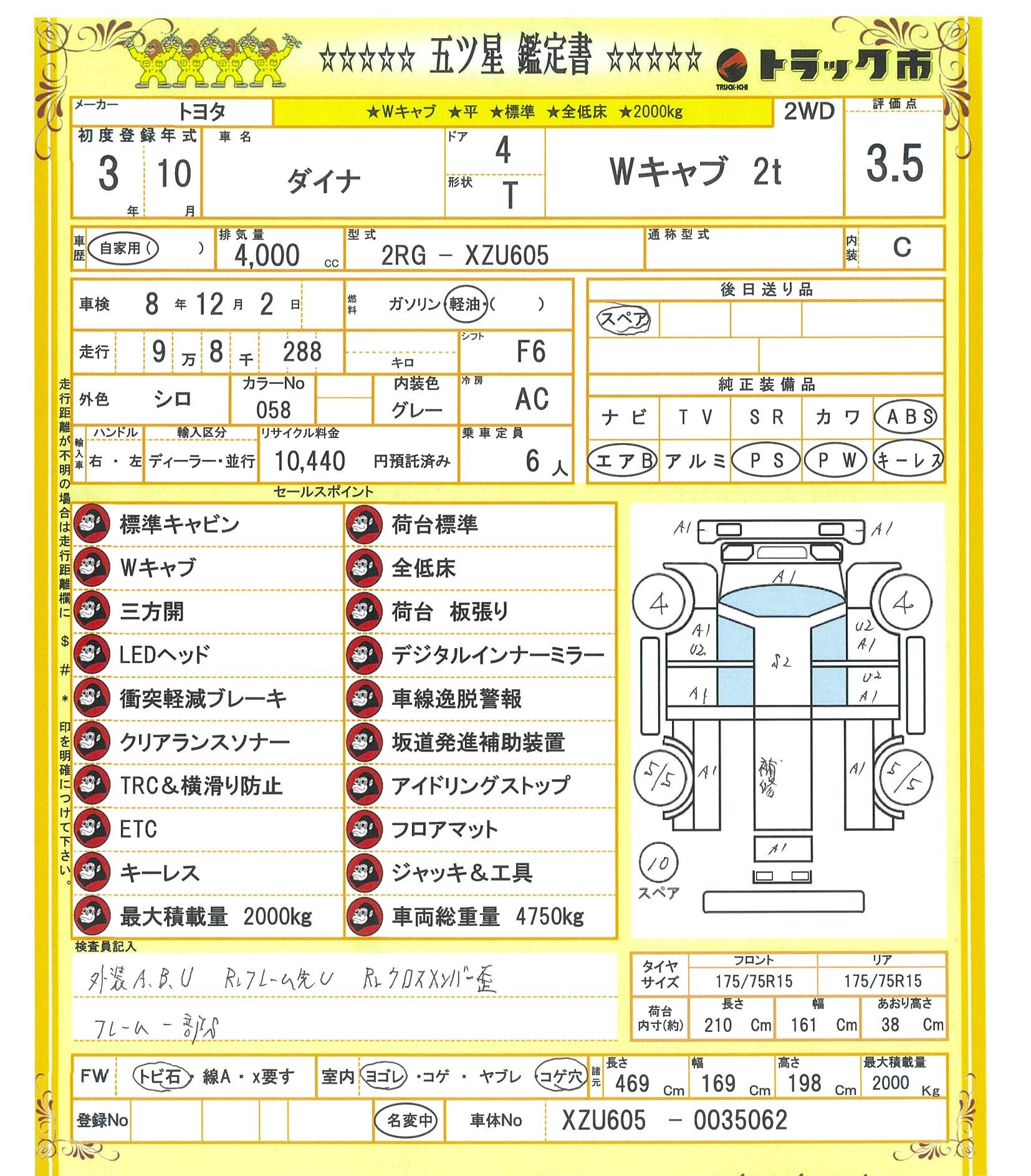 【車両外寸】長さ469cm /幅169cm /高さ198cm