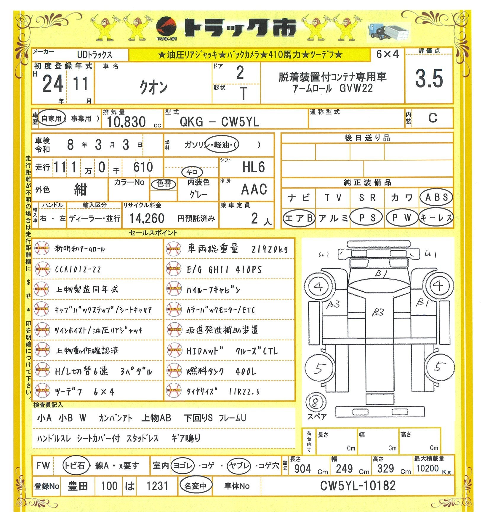 【Y250L0022】UDトラックス クオン UDトラックス クオン アームロール 脱着装置付コンテナ専用車 GVW22 10.2t