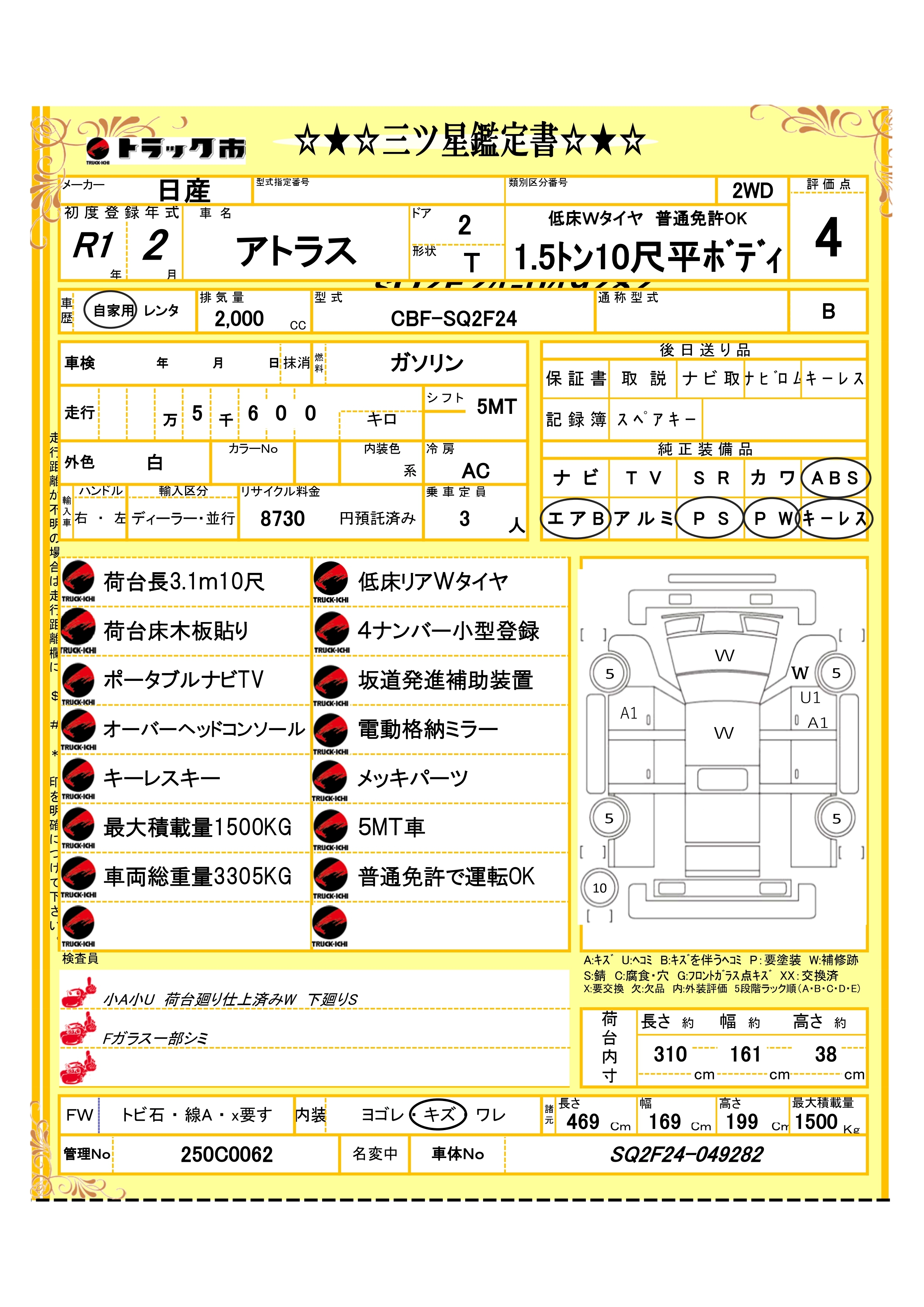 【Y250C0062】日産 アトラス 1.5トン低床10尺平ボディー ナビTV キーレス 5MT 普通免許で運転OK